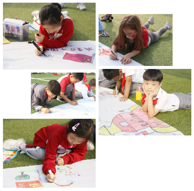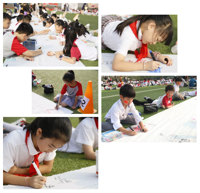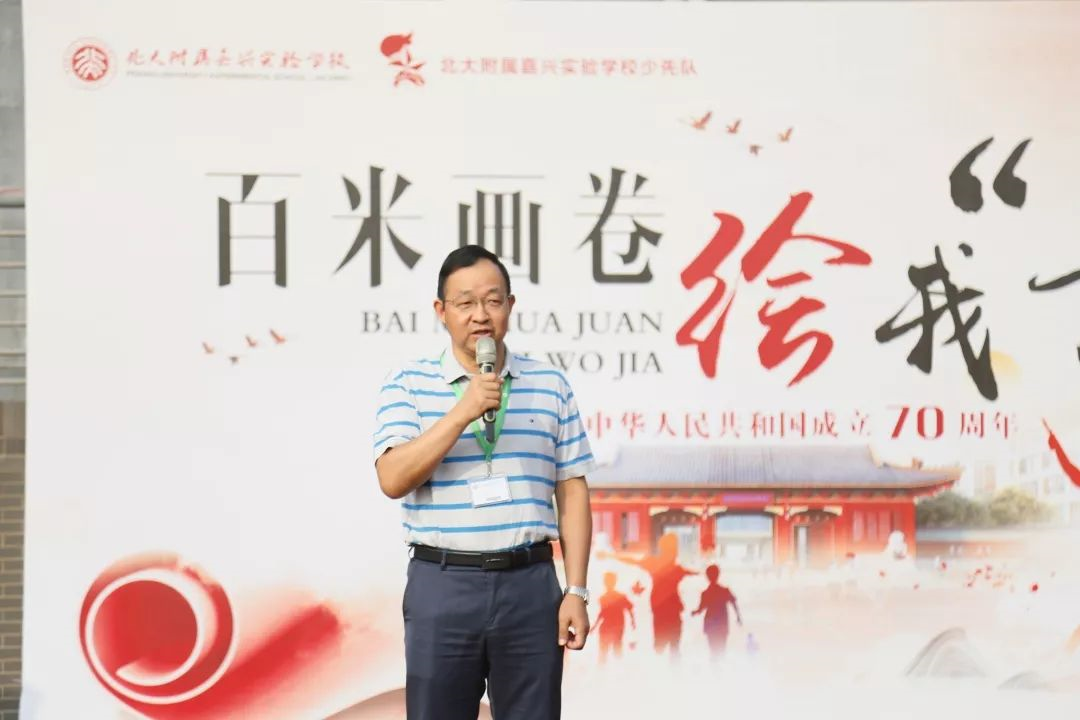 一幅幅百米畫卷,逐漸呈現(xiàn)在人們眼前,五星紅旗、天安門廣場、大閱兵、校園生活……各種各樣的題材,五彩繽紛的色彩,讓美麗的畫卷在陽光下熠熠生輝。