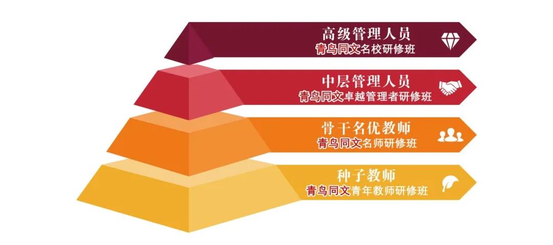為堅定落實青鳥同文教育“3511人才工程”(30位校長、園長(含儲備)、50位中層管理者(含儲備)、100位學(xué)科同文骨干名師、150位同文種子教師),逐步實現(xiàn)“以事業(yè)凝聚人、以創(chuàng)新吸引人、以愛心團(tuán)結(jié)人、以機(jī)制穩(wěn)定人”的人才發(fā)展理念。青鳥同文教育以各類人才實際發(fā)展需求為導(dǎo)向,有針對性地制定適配的課程體系,旨在培養(yǎng)優(yōu)秀的國際化學(xué)校領(lǐng)導(dǎo)者,未來教育的專家型人才,為集團(tuán)戰(zhàn)略發(fā)展提供智力支持,全面落實集團(tuán)的辦學(xué)理念和辦學(xué)目標(biāo),進(jìn)而提升集團(tuán)化辦學(xué)國際影響力。