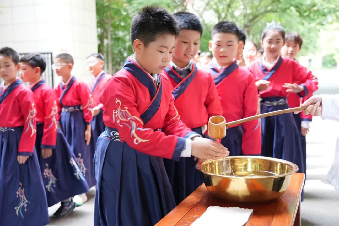 沃盥禮是中國(guó)古代在祭祀典禮之前的重要禮儀。此禮儀蘊(yùn)含著凈手凈心,去雜存精,也希望孩子們能在成長(zhǎng)的過(guò)程中洗去浮躁、稚氣,留下沉穩(wěn)和儒雅。