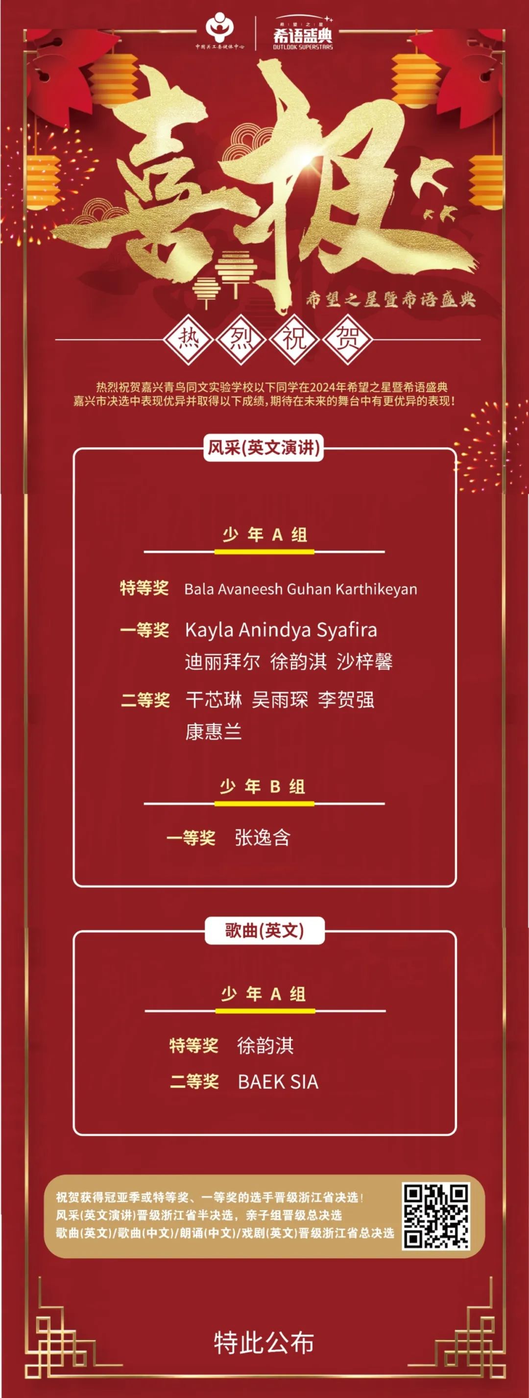 這一系列的紀錄突破,彰顯了嘉興同文學子在英文賽事中的卓越水平和不懈追求。我們將繼續(xù)以更高的標準,更堅定的信念,書寫著屬于我們的輝煌篇章,為校園帶來更多的榮耀與驕傲!