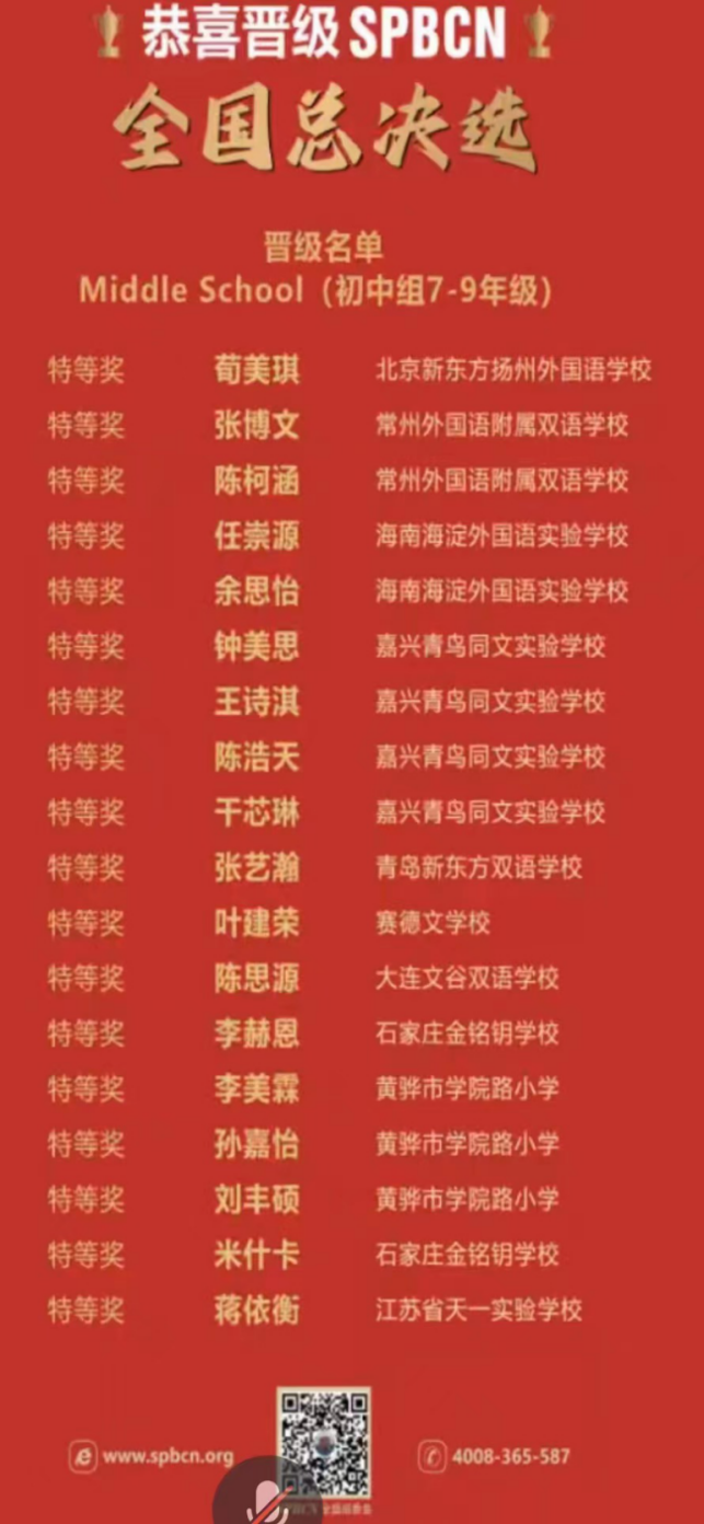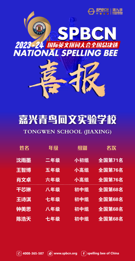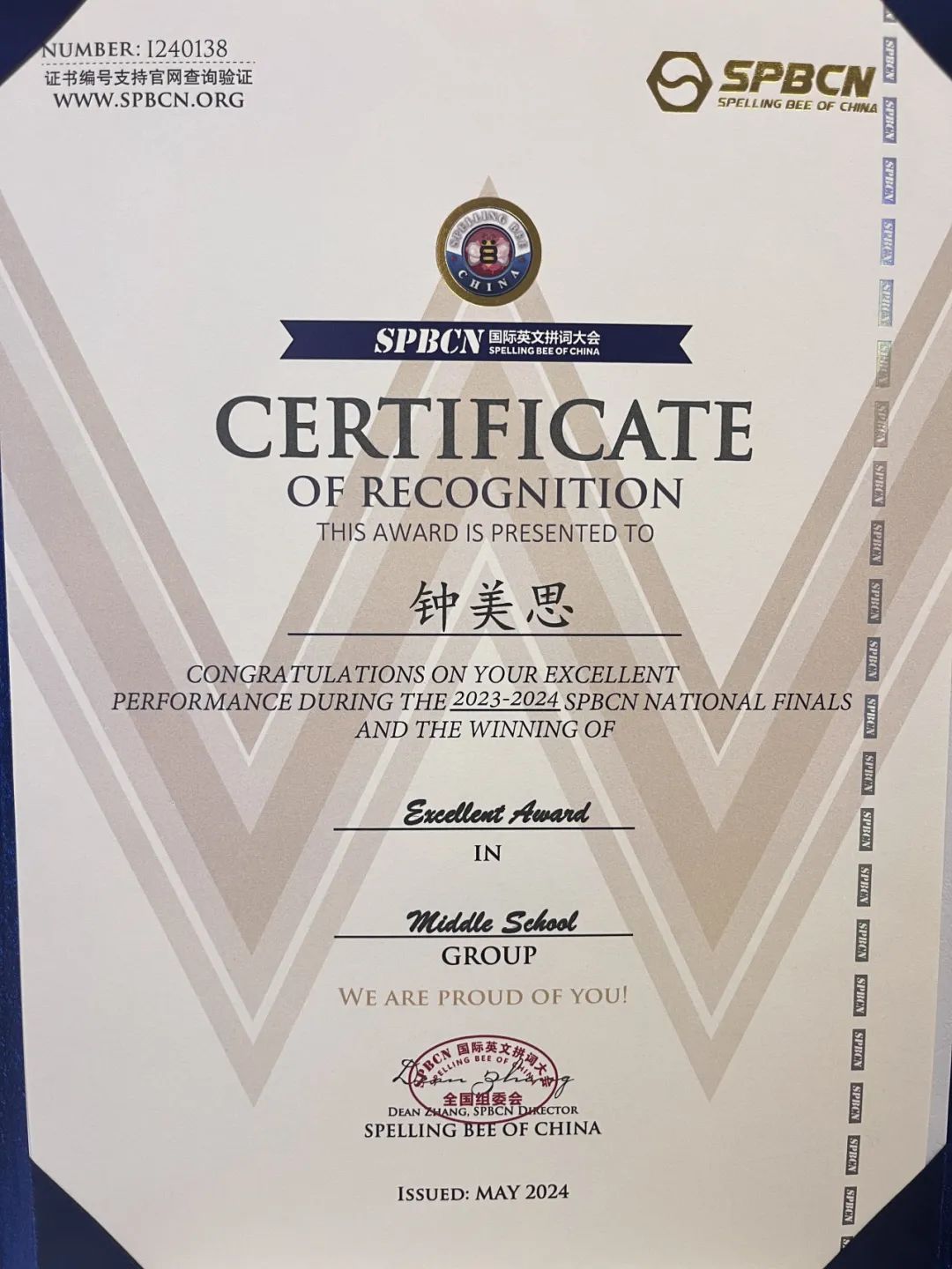 作為浙江省個人賽區(qū)派出選手最多的學校,我們有4名優(yōu)秀選手在五一期間前往北京參加了全國總決賽。在全國Spelling Bee個人賽初中組的百人角逐中,經(jīng)過多輪激烈競爭,我校的4名選手最終躋身全國68強,斬獲卓越獎項,為他們的學習生涯又增添了一枚重要的獎杯!