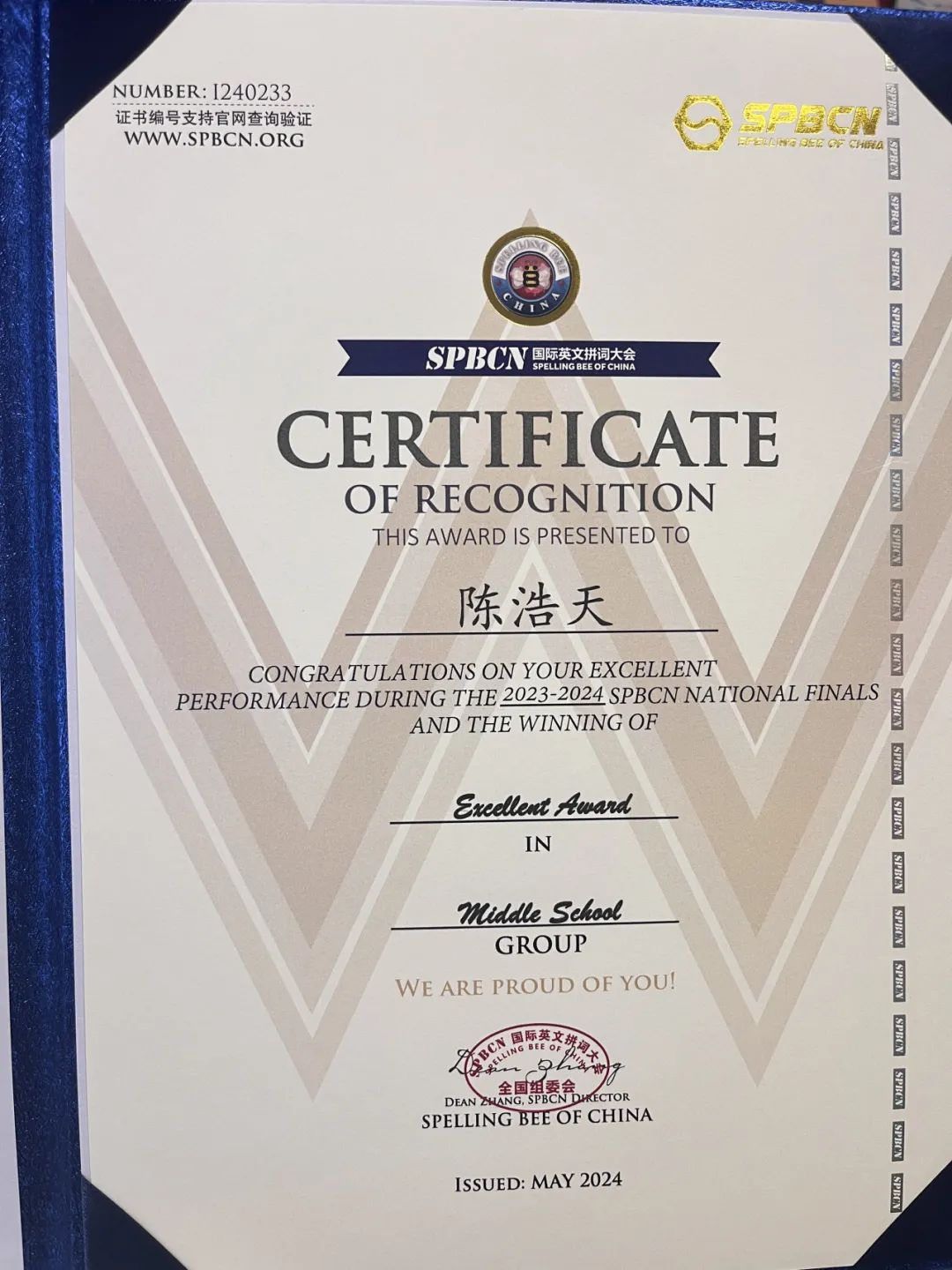 It is a great honor for me to participate in the Spelling Bee national competition in Beijing this time. This is my first time entering this competition in three years of participating in Spelling Bee, and I am very happy. I am particularly grateful to Ms. Viya and Mr Richard's guidance during regular classes and assistance after class. At the same time, I believe that this competition is a great challenge and opportunity for exercise. Although I didn't achieve very good results, But I made many new friends and also met many strong opponents in this competition. Next time, I will work harder to prepare and hope to achieve a good result!
