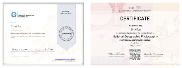 準(zhǔn)11年級的Miles同學(xué)利用網(wǎng)絡(luò)平臺完成了意大利時尚與奢侈品公司管理課程、歐洲國家地理攝影課程,并獲得相應(yīng)證書,提升了自己在商科以及攝影方面的技能;